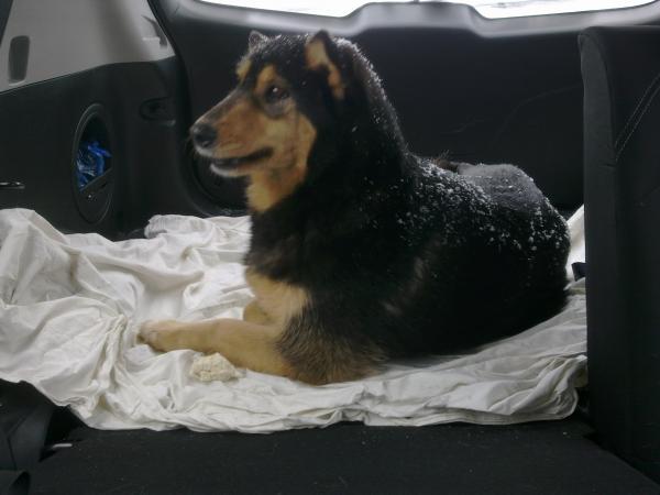 Планы изменились, поэтому на день раньше получилось выехать. Девочка спокойная, рассудительная, вела себя относительно хорошо. В зимнике мы попытались одеть ей ошейник и поводок, всё дала сделать, а потом в 2 секунды перекусила брезентовый поводок. Поэтому вывезли нам ее в клетке, как буйного медведя В машине немного металась, но в рамках приличия. С интересом смотрела в окно.