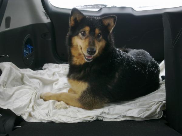 Когда приехали на передержку, она сама вылезла из багажника (мы ей заранее прикупили амуницию и одели в машине). Она походила по снегу, всё понюхала, потом стала немного нервничать и мы пошли в квартиру. В подъезд с удовольствием забежала, а вот лестница стала серьезным препятствием, потому я тащила ее за шлейку. Потом в квартире села около двери в ванную и уже ее было не сдвинуть.