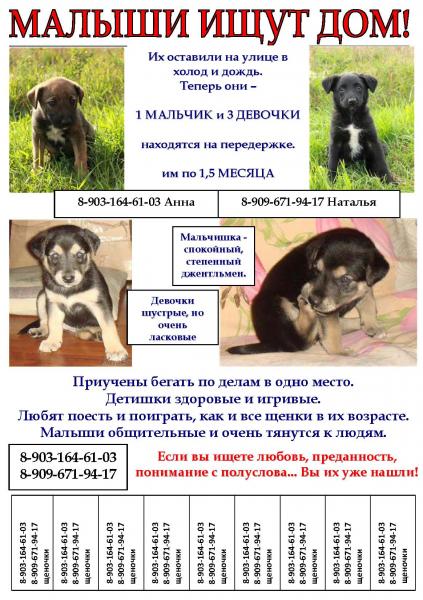 Четыре очаровательных создания ищут дом. Их оставили на улице в холод и дождь. А теперь они - мальчик и 3 девочки находятся на передержке. Им полтора месяца. Приучены бегать по делам в одно место. Детишки здоровые и игривые. Мальчишка - спокойный, степенный джентльмен. А девчонки пошустрее, но очень ласковые. Все малыши любят поесть и поиграть, как и все щенки в их возрасте. Малыши общительные и очень тянутся к людям. Если вы ищете любовь, преданность, понимание с полуслова... Вы их уже нашли! 89031646103 Анна 89096719417 Наталья