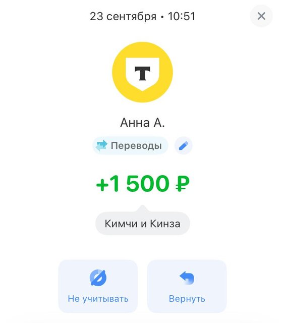 VISA9419 08:43 Перевод из Т‑Банк +120р от ЕКАТЕРИНА П. «Кимчи и кинза от Валя С.»