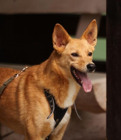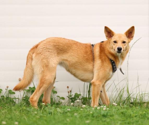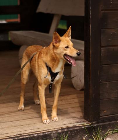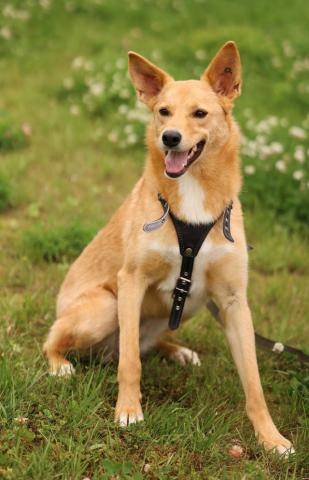 С собаками не конфликтует, гуляет на общем выгуле. Ориентируется на знакомых уверенных собак, возможно пристройство второй собакой.