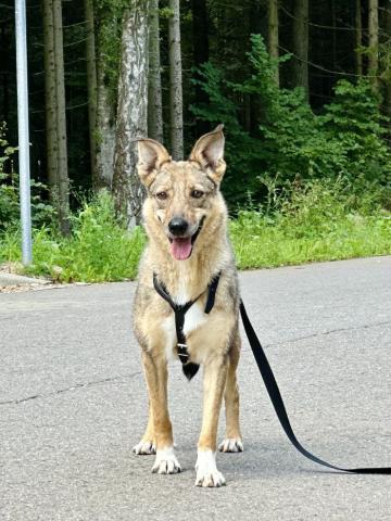 Она ориентируется на прогулке на человека, не тянет поводок, принимает поглаживания и не избегает общения.